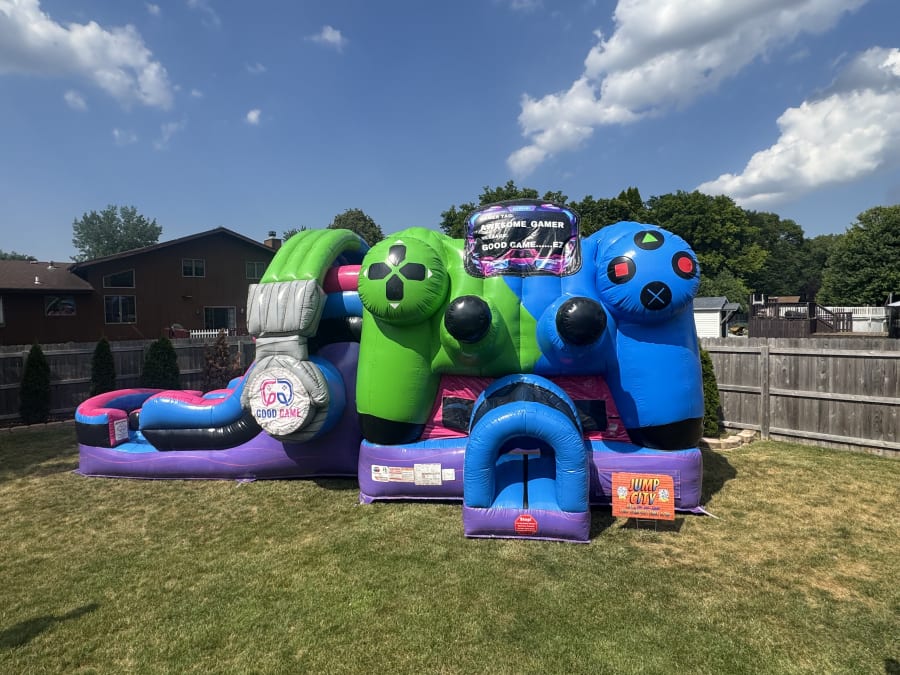 Get ready to embark on a gaming adventure like never before with our Game Station Bounce House Slide Combo! Transform any event into a pixelated paradise, where bouncing and sliding meet the excitement of video game fun. Step inside the inflatable Game Station and bounce your way into a world filled with pixels and power-ups. The spacious bounce house area is perfect for gamers of all ages to jump, play and level up. Bring the joy of gaming to the real world with our Game Station Video Game Themed Bounce House Slide Combo. It's more than just bouncing – it's a gaming experience that transcends the screen!