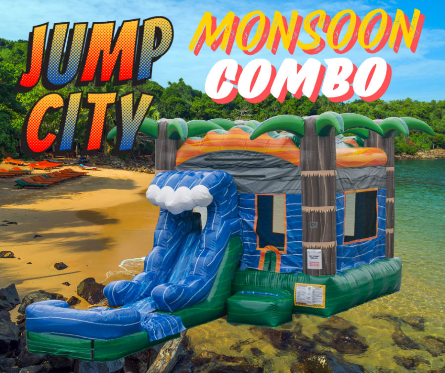 Let the fun begin with our Monsoon Bounce House Combo! This vibrant inflatable castle features a spacious bouncing area and built-in water or dry slide, perfect for sliding and splashing around. Made from durable materials and equipped with safety features, it provides a secure and exhilarating play space even on rainy days. Bring the excitement of the outdoors inside with our Monsoon Bounce House Combo.