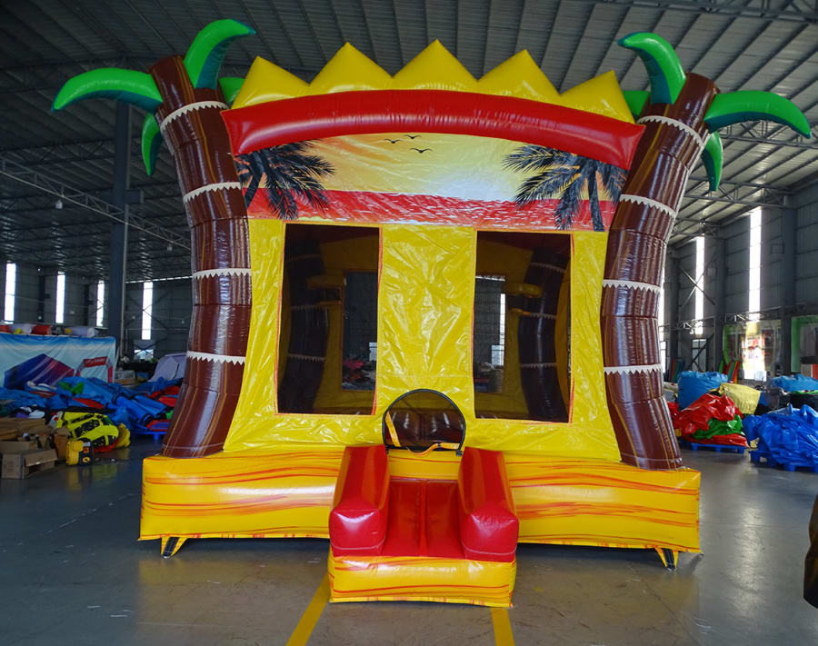 Immerse yourself in the splendor of a sunset with our captivating bounce house, featuring vibrant shades of orange, yellow, and red that mimic the colors of the evening sky. Adorned with silhouettes of palm trees and seagulls, this inflatable masterpiece sets the stage for an unforgettable adventure and endless hours of fun!
