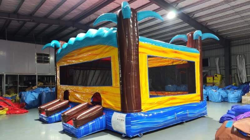 The vibrant tropical-themed graphics feature bold colors and eye-catching palm trees, giving your guests a true island paradise experience. With its extra-large size, the Tropic Shock is perfect for larger parties, school events, or community gatherings. Kids and adults alike will be drawn to its fun, safe, and spacious bouncing area.