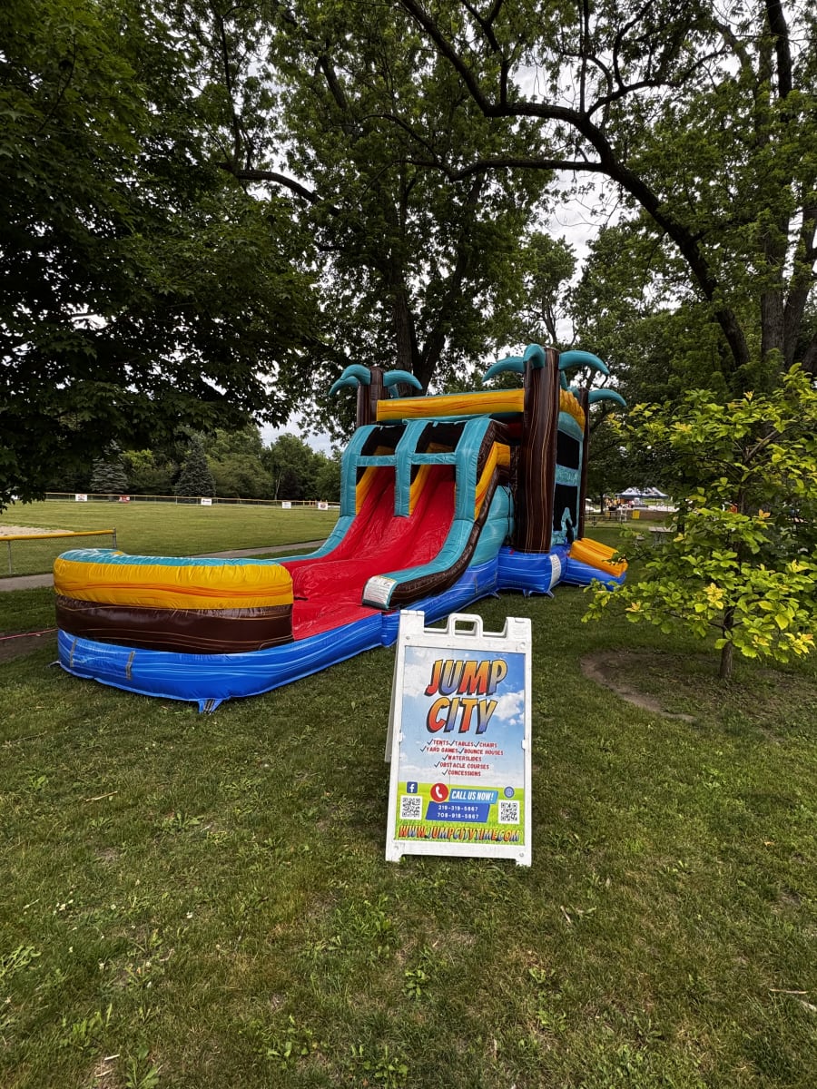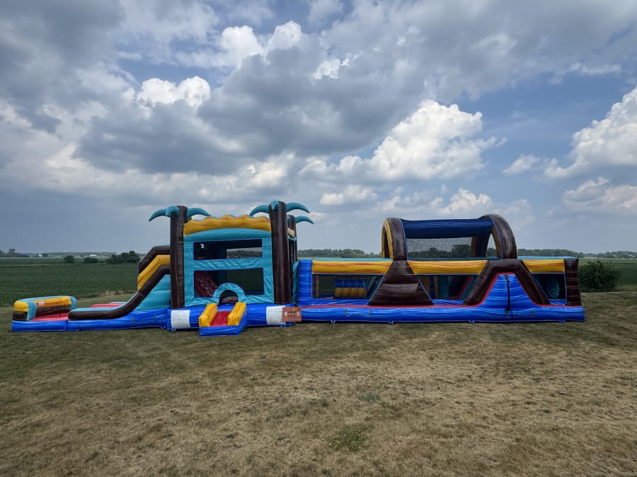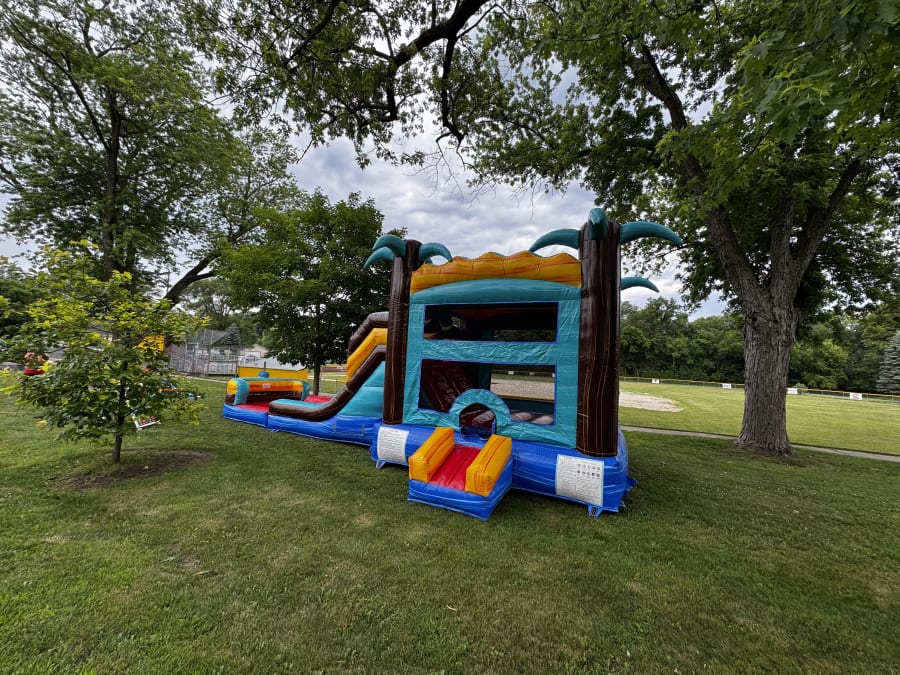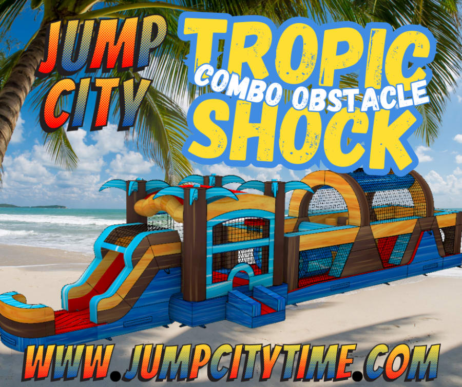 Get ready to experience the ultimate tropical adventure with the Tropic Shock Combo Obstacle Course! This vibrant and exciting inflatable brings the fun of a water park right to your backyard, combining the thrill of a bounce house, dual lane water slide, and an obstacle course into one incredible play structure. Perfect for birthdays, summer parties, and any outdoor event, it guarantees hours of action-packed fun for kids of all ages. The bold, tropical colors and palm tree accents make this inflatable a visually stunning centerpiece for any party, creating an exciting island vibe everyone will love. The challenging obstacle course features climbing walls, tunnels, and other fun challenges to navigate, pushing kids to test their skills while having a blast. Bring the excitement of a tropical water park to your backyard is the ultimate way to add a splash of fun and adventure to any occasion. Let the tropical fun begin!
