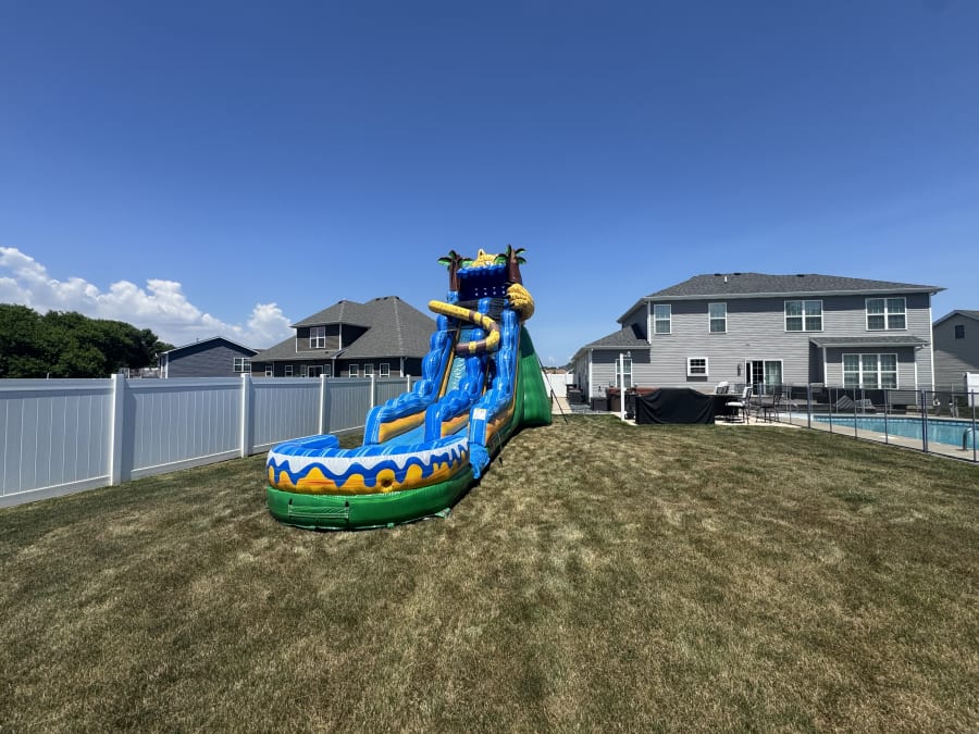 Dive into the excitement with our 20ft HIDDEN JAGUAR WATERSLIDE. This towering slide is not just a ride – it's a thrilling journey through the heart of the jungle. As you ascend to the top, you'll discover the hidden jaguar theme, adding an element of mystery to your slide. The high sidewalls ensure a safe descent into the splash pool below, making this inflatable waterslide a must-have for backyard fun and event entertainment.