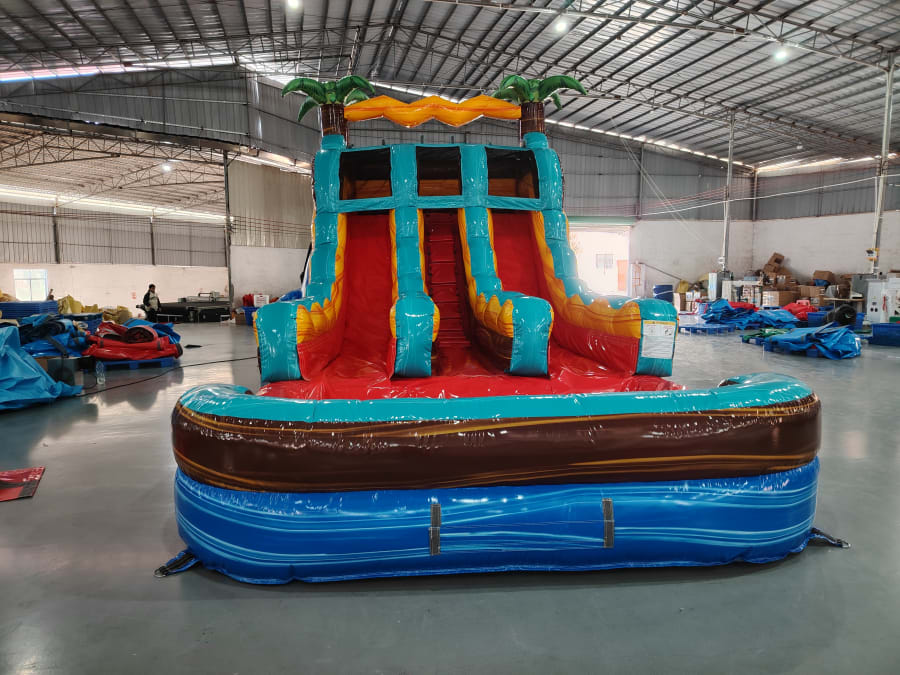 With its vibrant tropical design—palm trees, waves, and sun-soaked colors—this waterslide is more than just a ride; it's a tropical getaway! The smooth, fast slide ensures that everyone will have a blast as they race down into the splash pool below. Made with high-quality, durable materials, the Tropic Shock 15ft Waterslide is built for safety, so you can enjoy the fun with peace of mind.