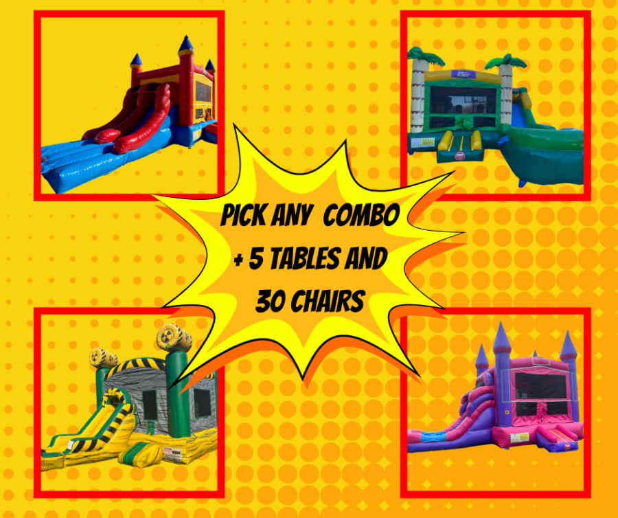 and comes with everything you need for your party. It gives you your choice of one of four combo units along with five table and 30 chairs.